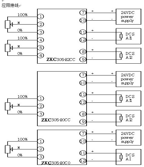 ZKC305接收現場的電位器信號,變換為與阻值成線性的標準信號,輸出給DCS或其他二次儀表,信號隔離能有效抑制各種干擾。
