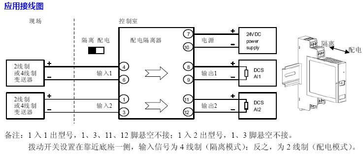 ZKC302E 配電隔離器 功能 本產(chǎn)品兼容配電和隔離2 種模式:配電模式,向現(xiàn)場的2 線制變送器提供工作電源,采樣變送器輸出的2 線制電流信號,經(jīng)過隔離處理后轉(zhuǎn)換為4 線制電流信號輸出;隔離模式,采樣4 線制電流信號,經(jīng)過隔離 輸出4 線制電流信號。通過產(chǎn)品上側(cè)內(nèi)置的撥動開關(guān)可設(shè)置輸入模式�?蛇x1 入1 出、1 入2 出、2 入2 出。