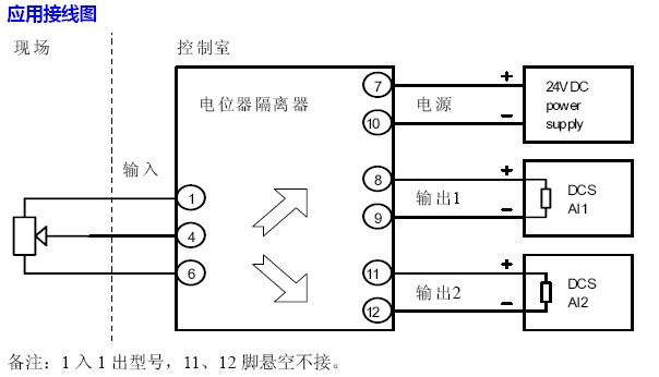 功能 接收現場的電位器(滑線電阻)信號,經過隔離處理,變換成與阻值成線性的電壓或電流信號輸出。可選1 入1 出、1 入2 出。