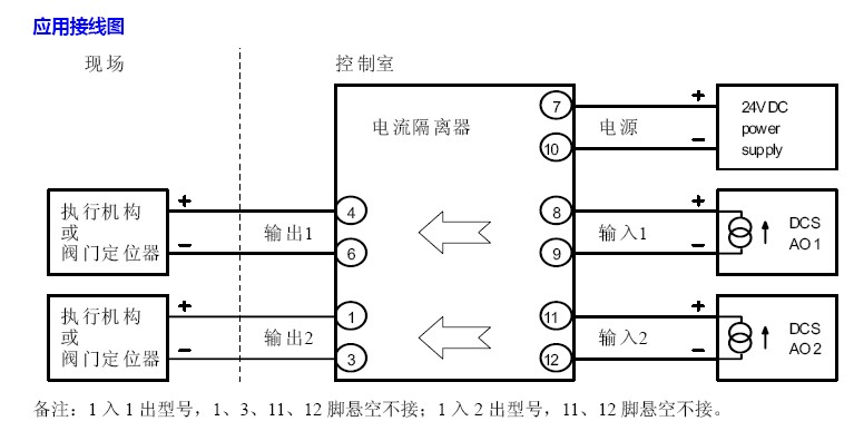 接收控制室的 4~20mA 電流信號,經過隔離,變換成用戶指定的電壓或電流信號,輸出給現場。可選 1 入 1出、1 入 2 出、2 入 2 出。