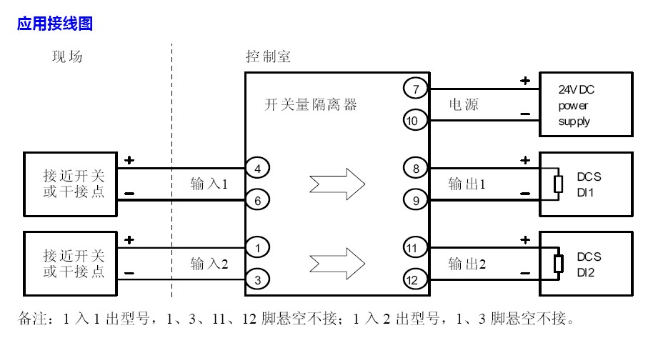 功能 接收來自現場的開關信號,如接近開關的信號,隔離后輸出。可選1 入1 出、1 入2 出、2 入2 出。