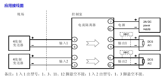 功能 采樣4 線制智能變送器輸出的4~20mA+HART 電流信號,經過隔離后輸出。本產品兼容HART 通訊,可用于智能變送器。可選1 入1 出、1 入2 出、2 入2 出。